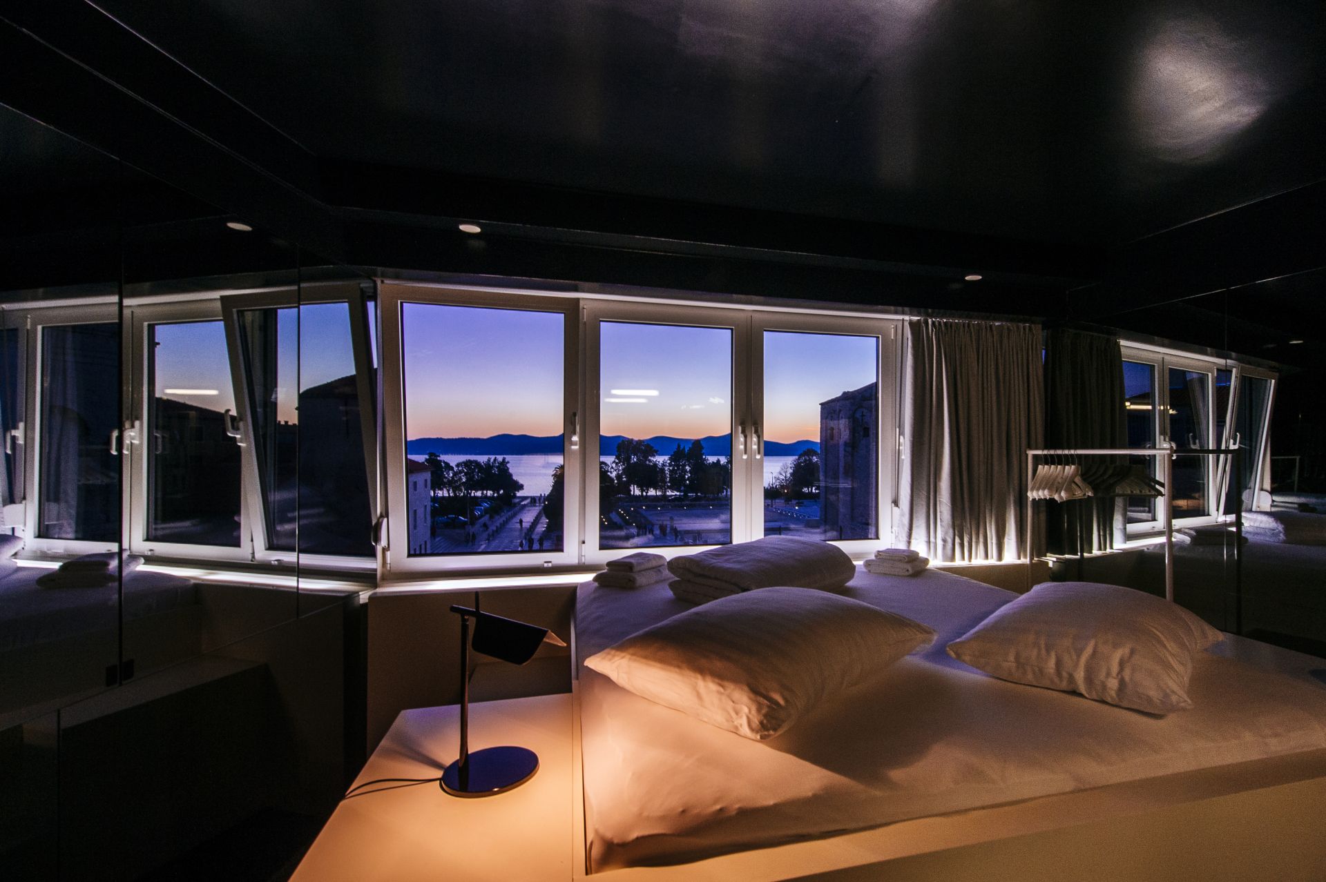 Ob du ein Vierbett- oder ein Einzelzimmer, ein Luxuszimmer, ein gestreiftes, schwarzes oder weißes Zimmer nimmst – die Aussicht hast du immer. Genauso wie Spinde, Wi-Fi, WC und Dusche. Und in manchen Zimmern bekommst du auf Wunsch auch eine Minibar.